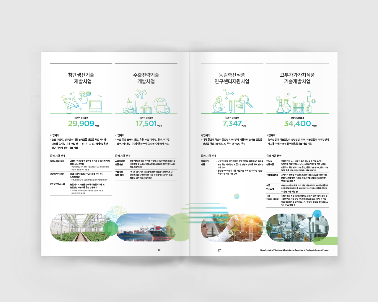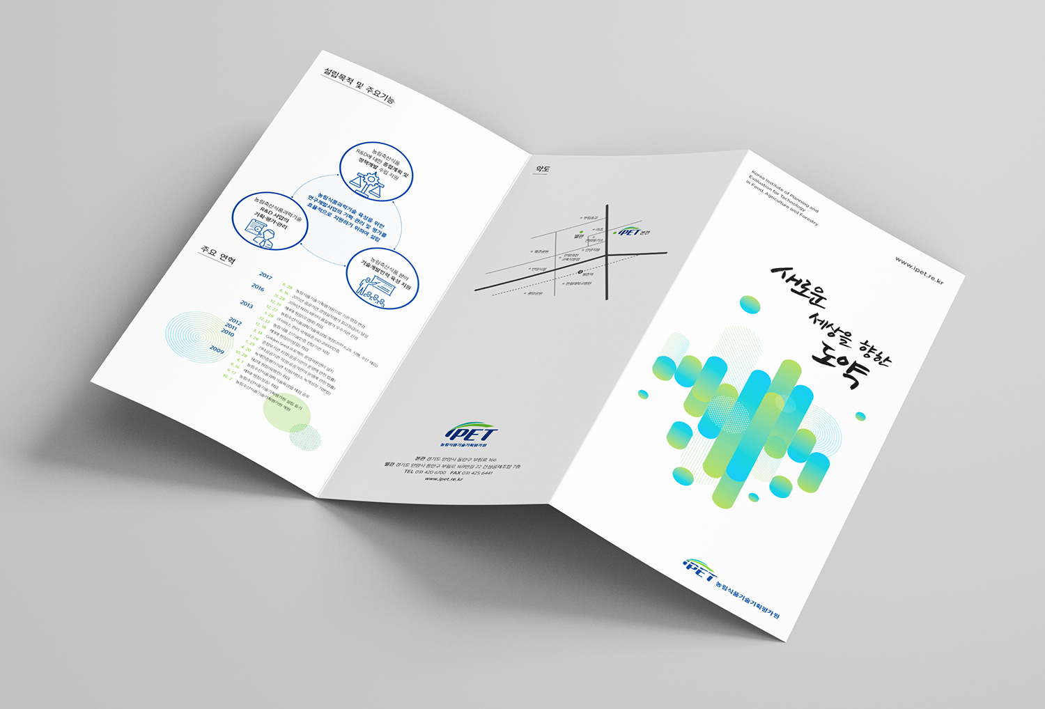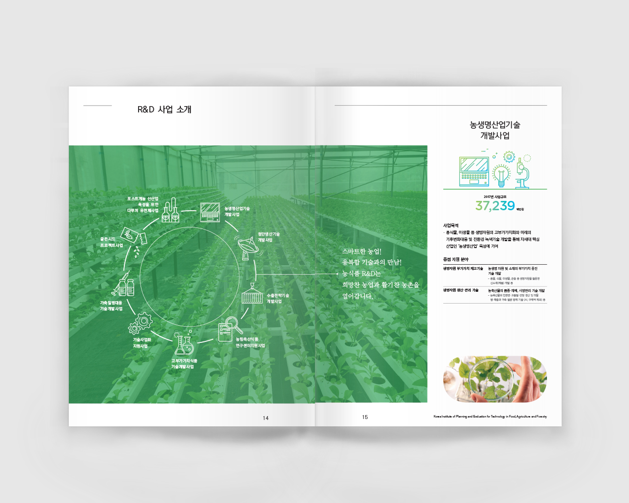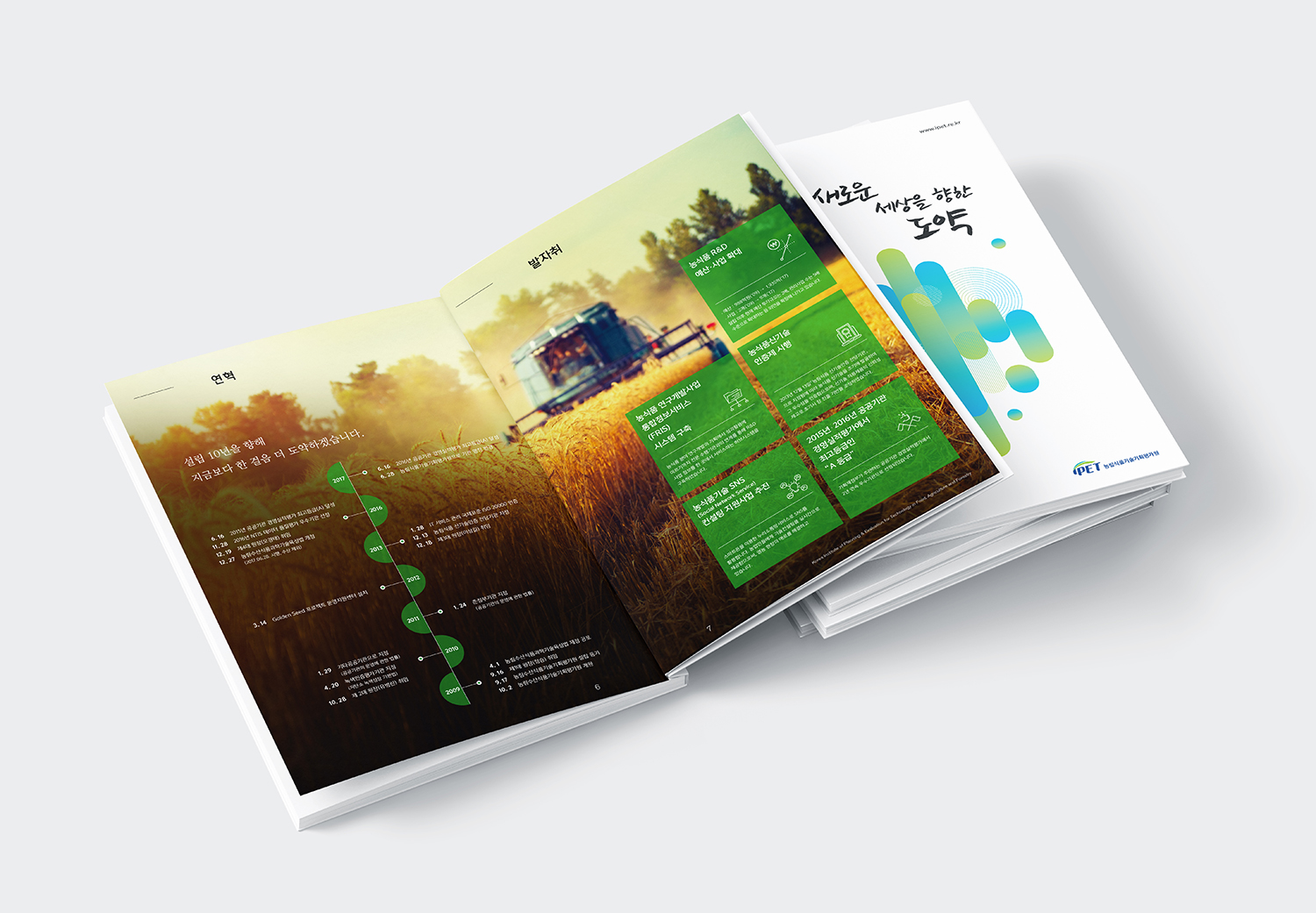 농림식품기술기획평가원이 축산이 빠지면서 사업분야 정립으로 새로운 인상을 남기기 위해 리뉴얼한 아이덴티티입니다. 농림식품과학기술을 선도하는 평가 기관으로의 연구 목표를 공고히 하기 위한 상징적인 혁신과 발전의 의미를 담은 디자인으로, 신뢰와 믿음의 블루톤을 사용해 농기평의 정체성을 돋보이는 안으로 재탄생하였습니다.