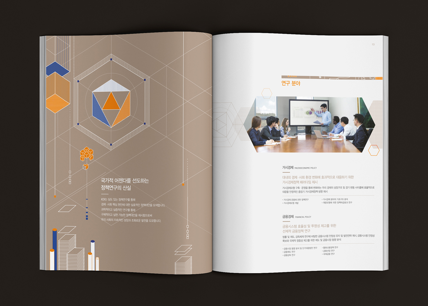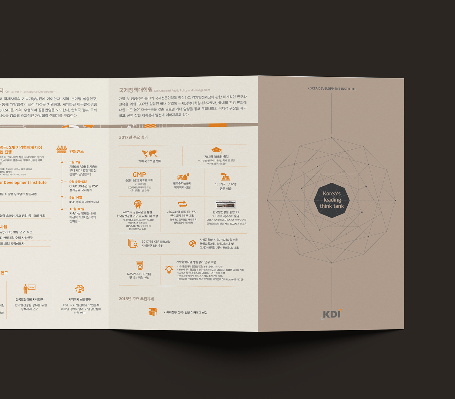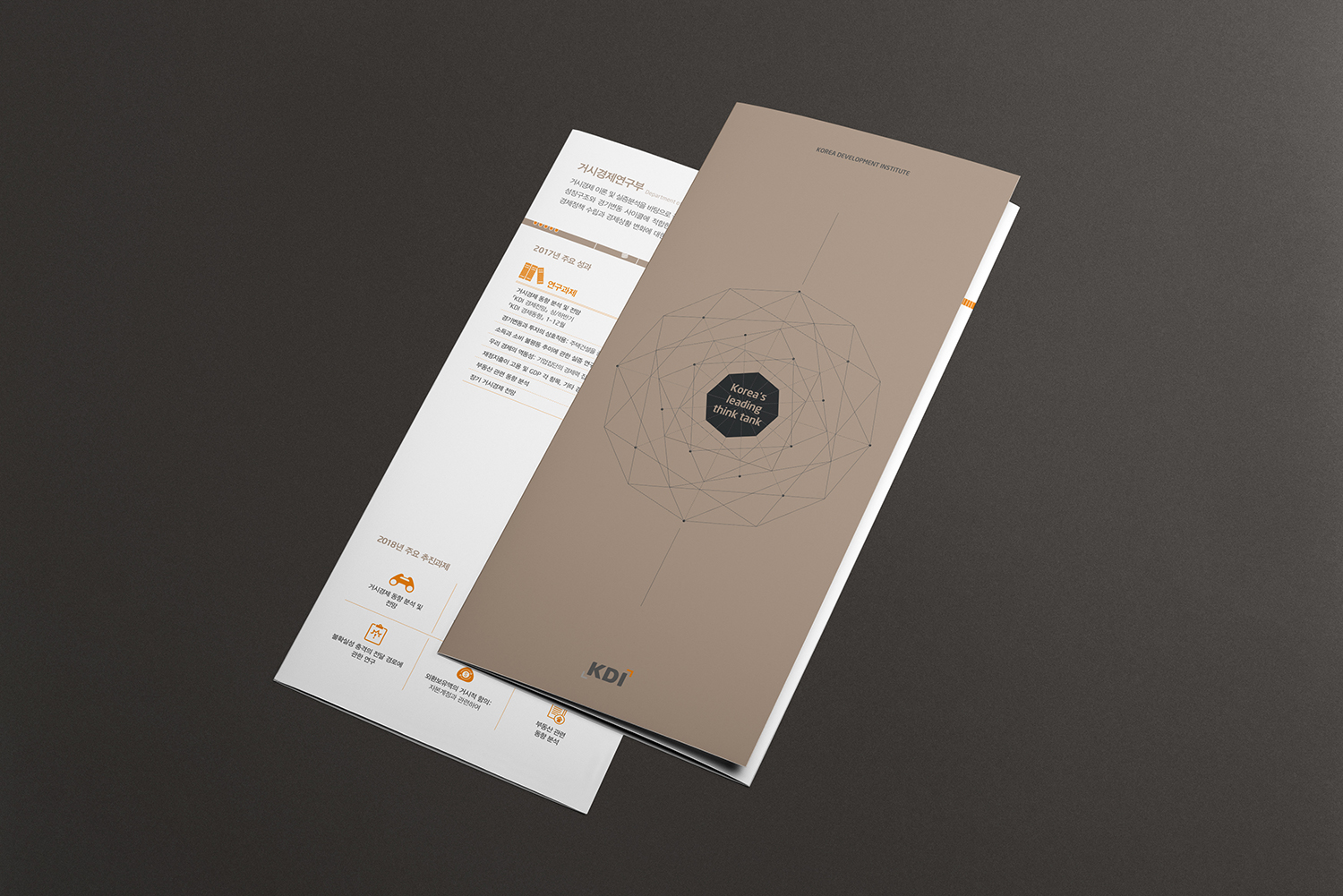 국내 사회과학분야의 유일한 종합 정책 연구기관인 한국개발연구원의 홍보 브로셔입니다. 수월성을 갖춘 정책 연구로, 합리적인 정책 대안을 제시하는 한국개발연구원의 연구 원칙을 프랙탈 구조의 반복되는 순환성으로 표현했습니다. 동시에 모든 분야가 연결된 통합연구의 메카임을 상위 개념의 골드컬러로 규정하고, 연구원의 메인 컬러인 오렌지를 포인트로 활용하여 주목성을 높였습니다.