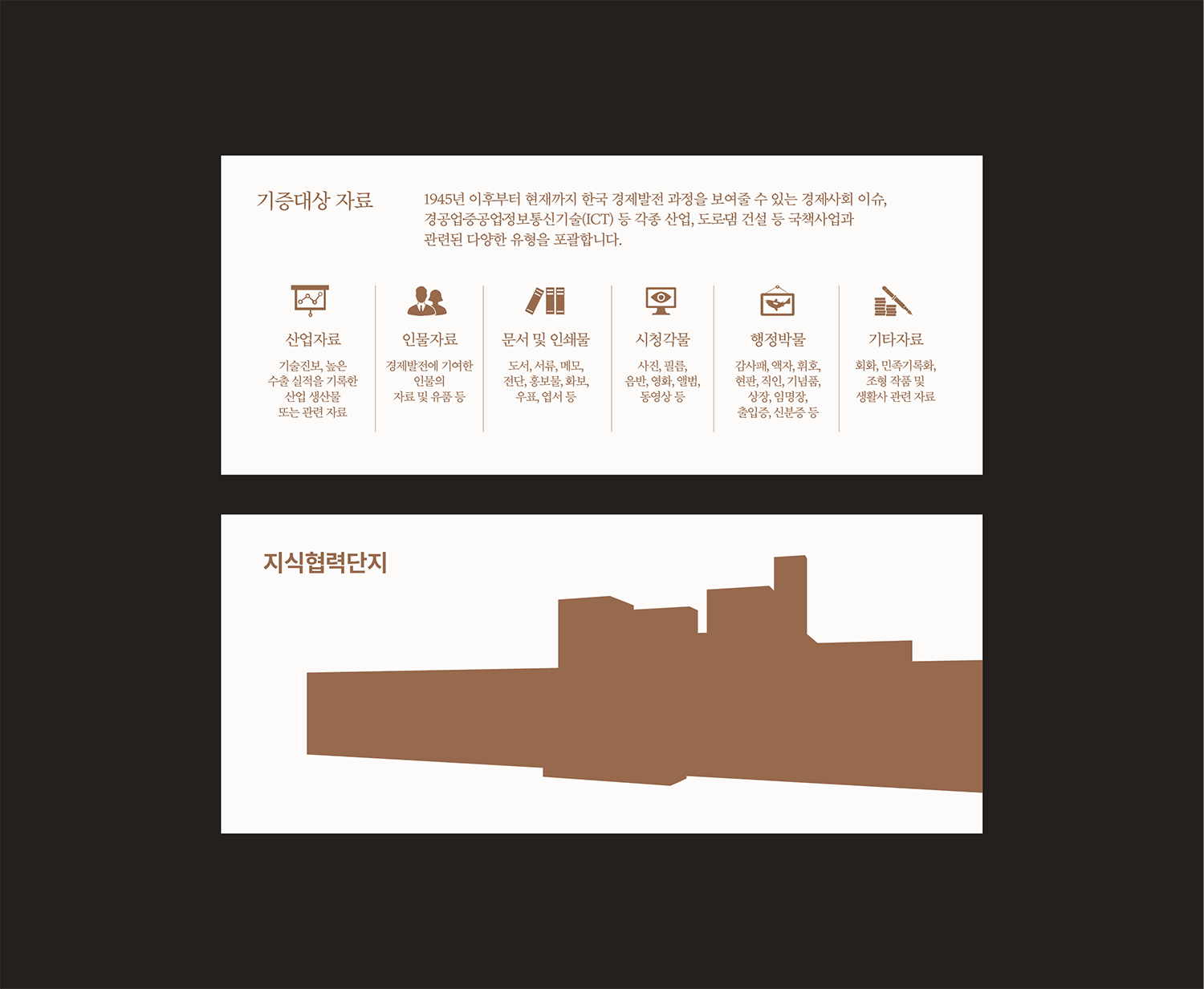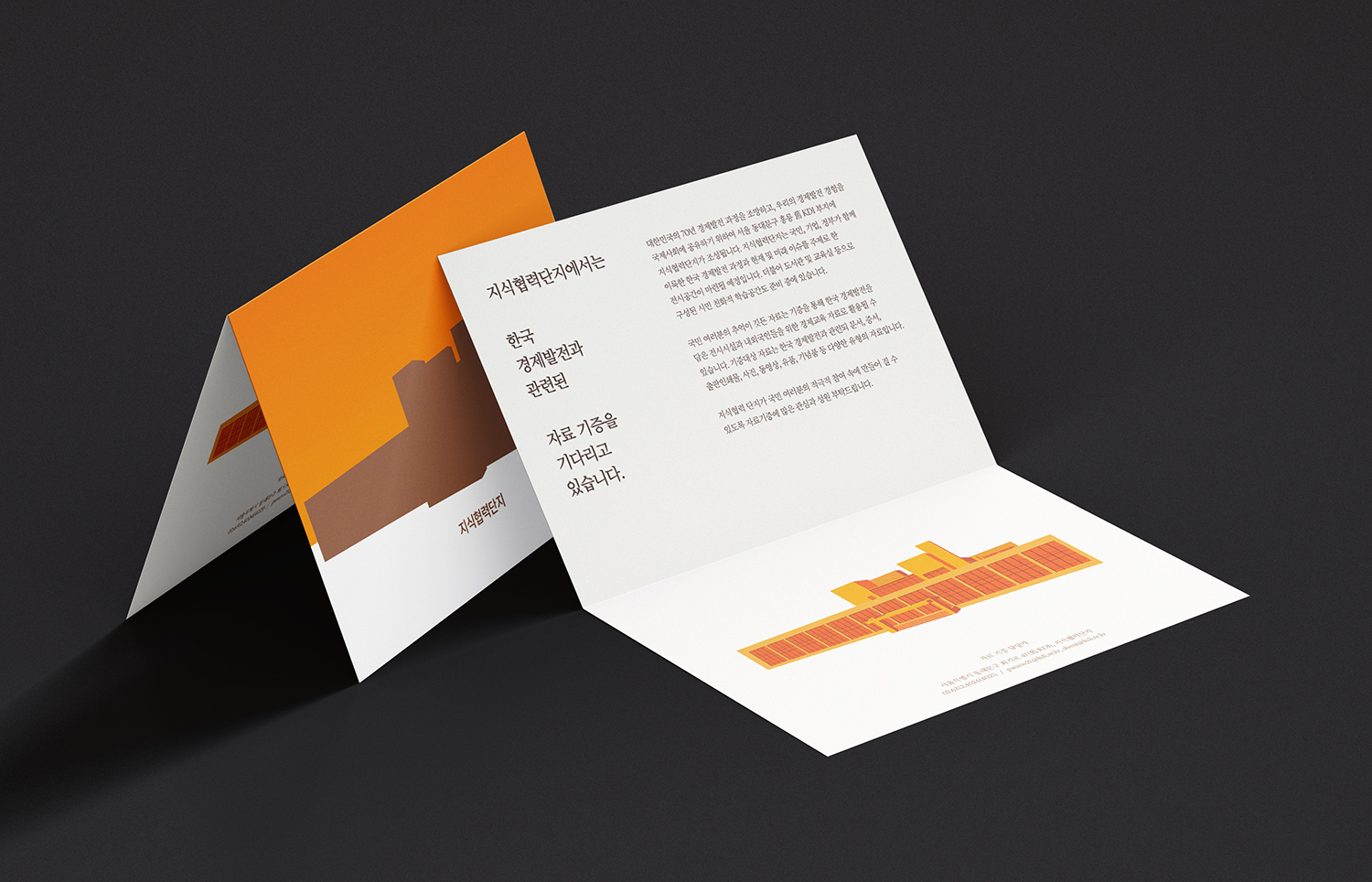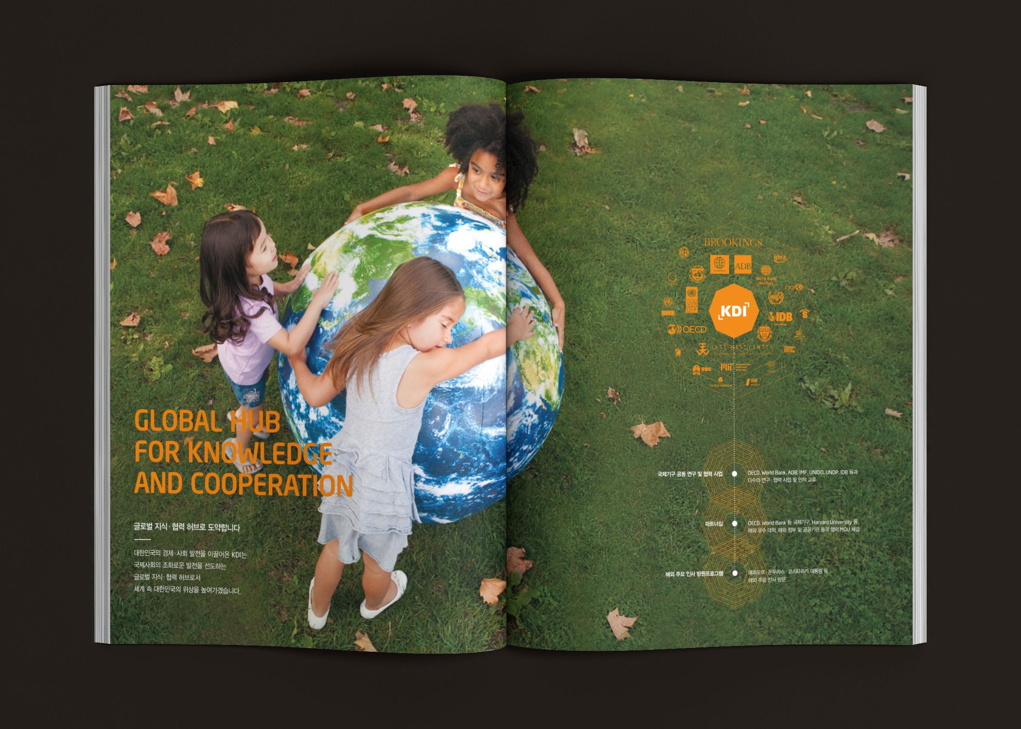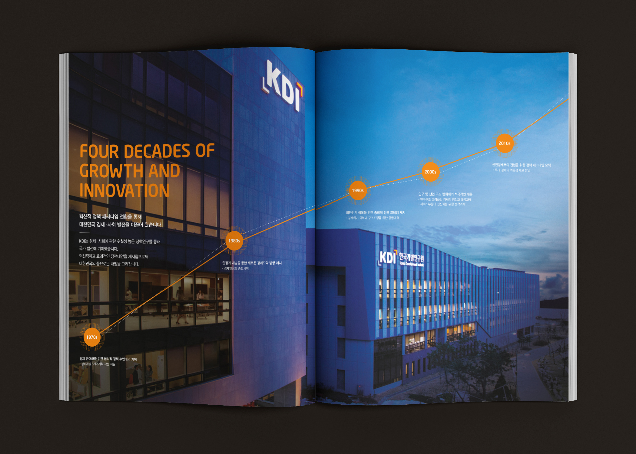 국내 사회과학분야의 유일한 종합 정책 연구기관인 한국개발연구원의 홍보 브로셔입니다. 수월성을 갖춘 정책 연구로, 합리적인 정책 대안을 제시하는 한국개발연구원의 연구 원칙을 프랙탈 구조의 반복되는 순환성으로 표현했습니다. 동시에 모든 분야가 연결된 통합연구의 메카임을 상위 개념의 골드컬러로 규정하고, 연구원의 메인 컬러인 오렌지를 포인트로 활용하여 주목성을 높였습니다.