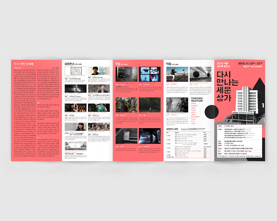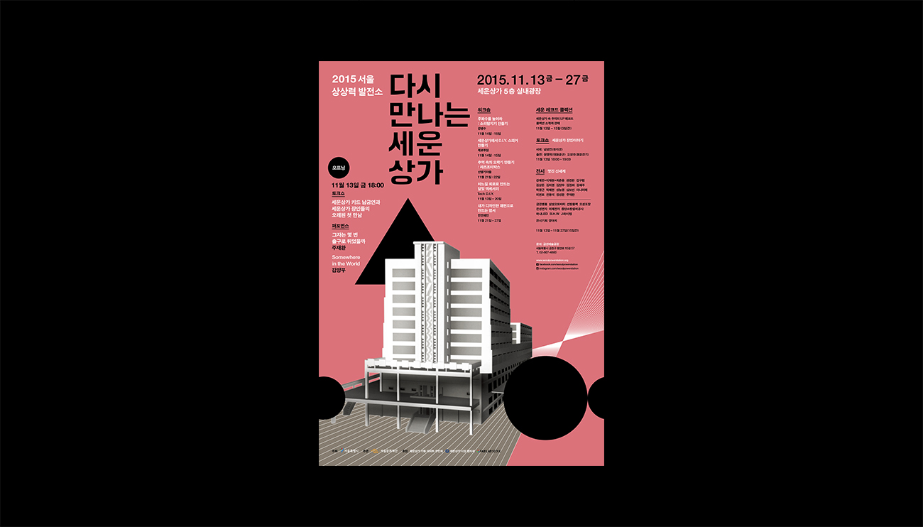 서울문화재단의 서울상상력발전소 <다시 만나는 세운상가> 행사의 기획과 대행 및 디자인을 진행했습니다. 세운상가가 예술가들과 서민들의 접점인 예술플랫폼으로 변화하고 발전하는 것을 목표로, 세운상가를 추억하고 재생산될 수 있는 컨텐츠로 만들기 위해 새로운 디자인과 전략이 필요했던 행사입니다.
