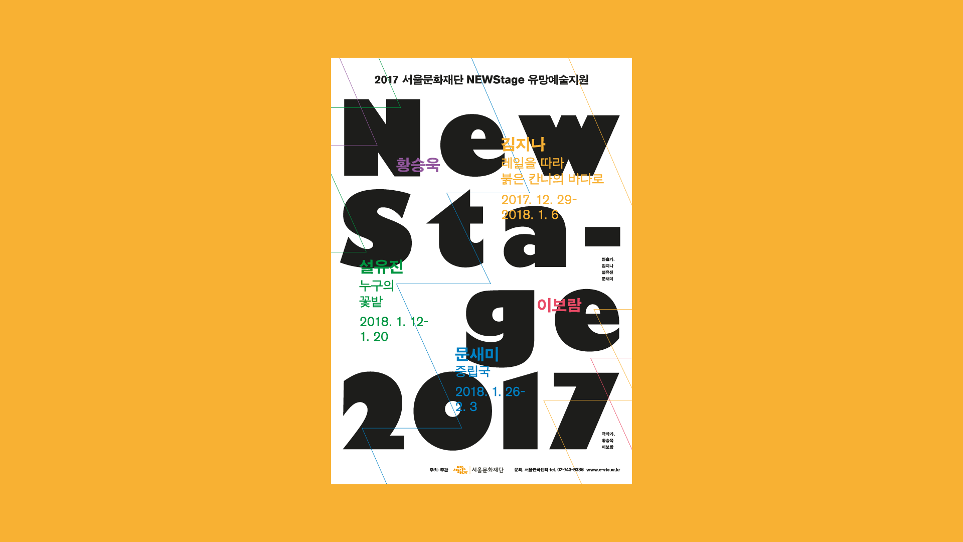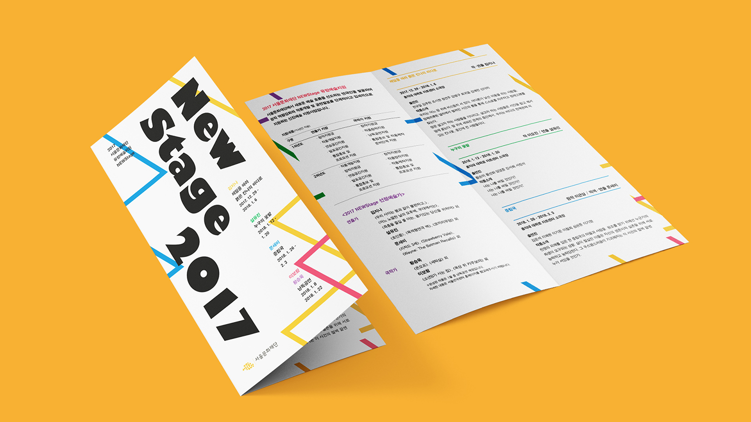 Project NEW STAGE 2017 Year 2018 Client 서울문화재단 유망예술지원사업 Service Promotion Design Poster / Leaflet Brochure 신진 연출가와 극작가의 작품 개발부터 무대에 오르기까지의 전 과정을 지원하는 서울문화재단 유망예술지원사업 의 디자인을 진행하였습니다.