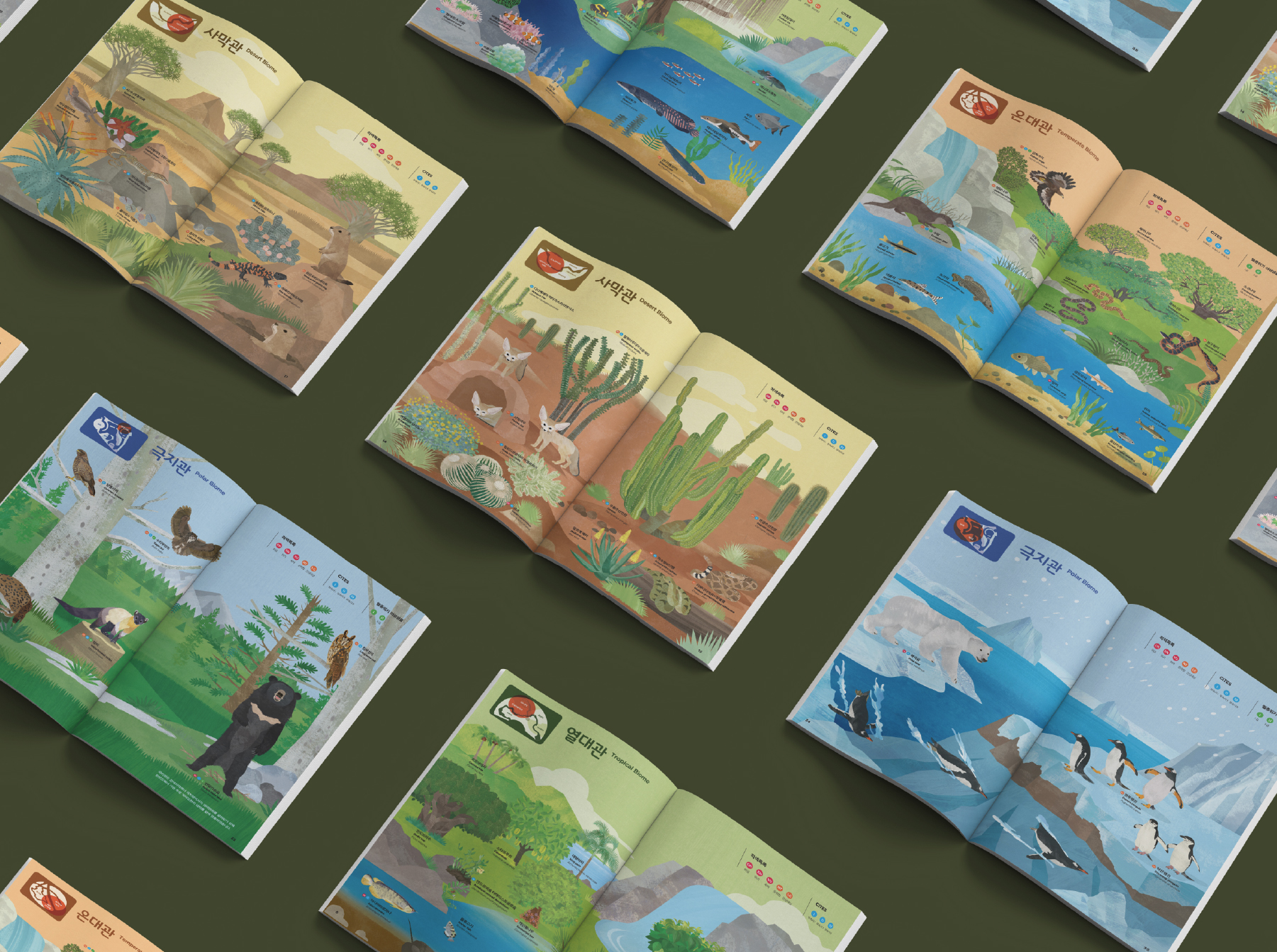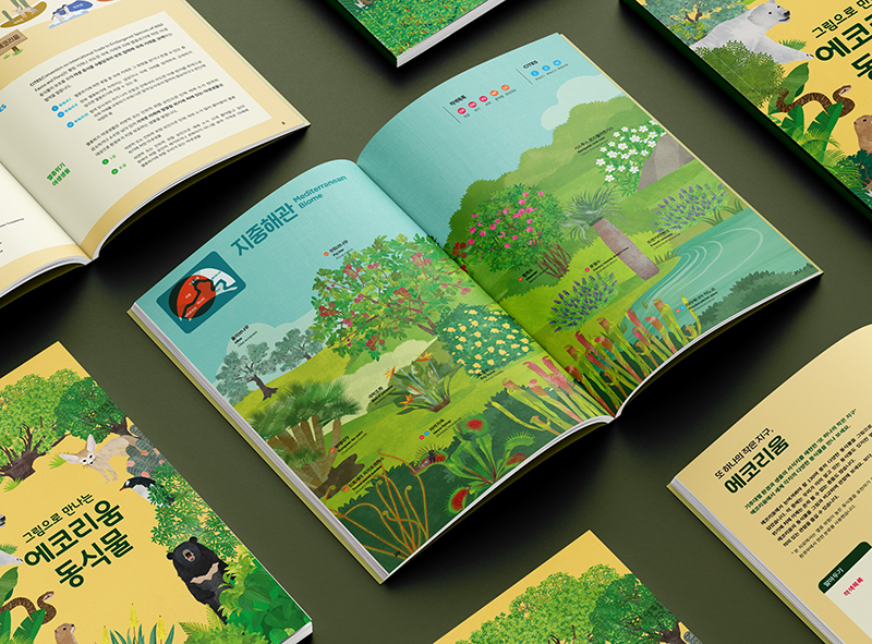Project NATIONAL INSTITUTE OF ECOLOGY, ECORIUM Year 2018 Client 국립생태원 Service Editorial Design Brochure 국립생태원의 에코리움에 있는 동식물의 모습을 일러스트로 표현하고 에코리움을 한눈에 알아볼 수 있도록 한 워크북 작업입니다. 일러스트레이션을 통해 좀더 친근하고 자세하게 동식물을 기후관별로 설명하였습니다.