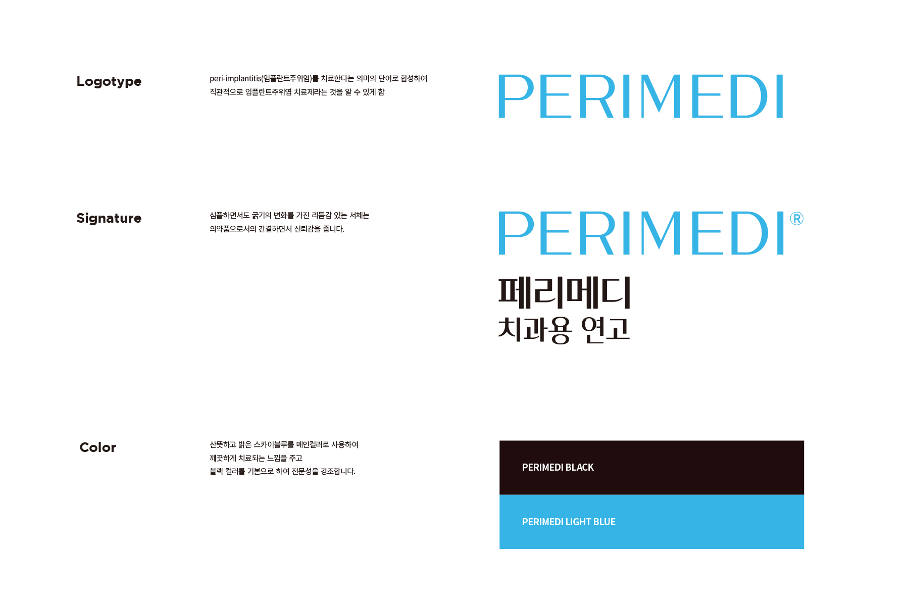 임플란트 후에 치주염을 앓고 있는 환자들을 위해서 몇차례의 임상실험을 통해 개발된 치과용 연고 페리메디는 전문 치의학 용어를 가지고 개발된 네이밍 작업으로 초반에 리서치와 아이디어 회의를 여러번 거듭하면서 구체화된 작업입니다. 잇몸에 침투하여 아주 작은 나노단위의 성분이 흡수되는 기능을 심플하게 상징화한 디자인입니다.