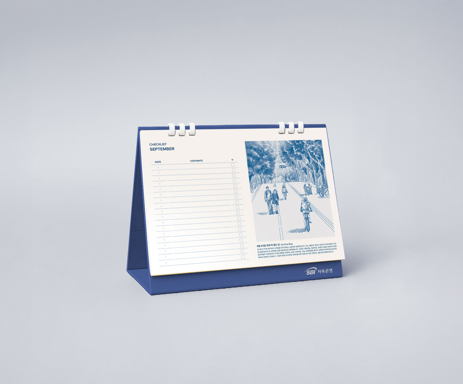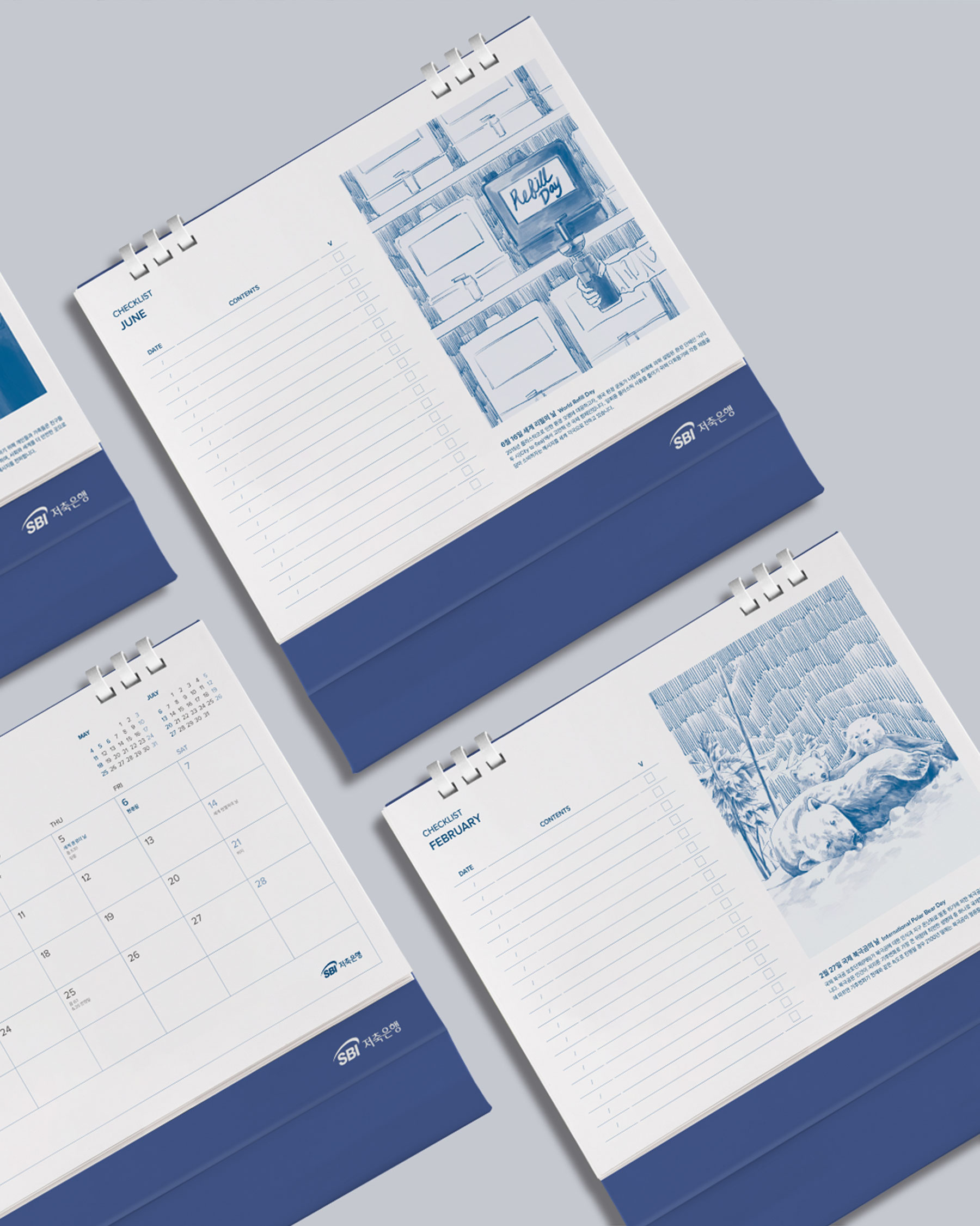 ESG 국제기념일을 일러스트로 시각화하고, 재활용이 가능한 페이퍼링 구조를 적용해 지속가능성을 강화했습니다. SBI의 CI 블루와 블랙을 중심으로 최소한의 컬러 팔레트로 인쇄하여, 브랜드 아이덴티티를 유지하면서도 절제된 심플함을 구현했습니다.