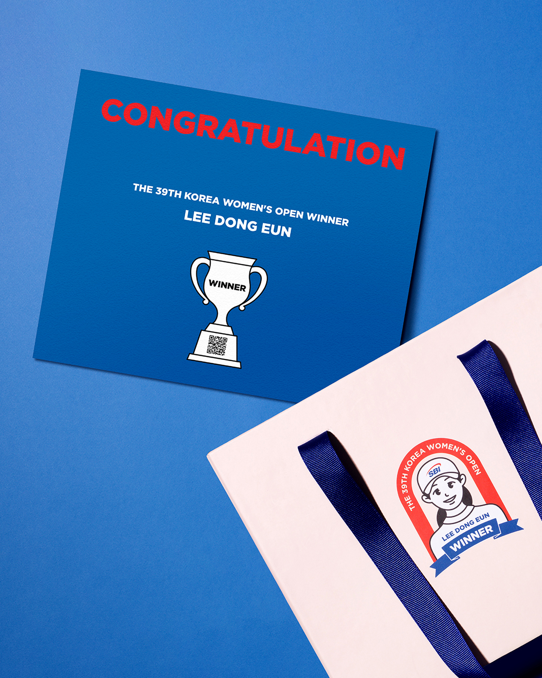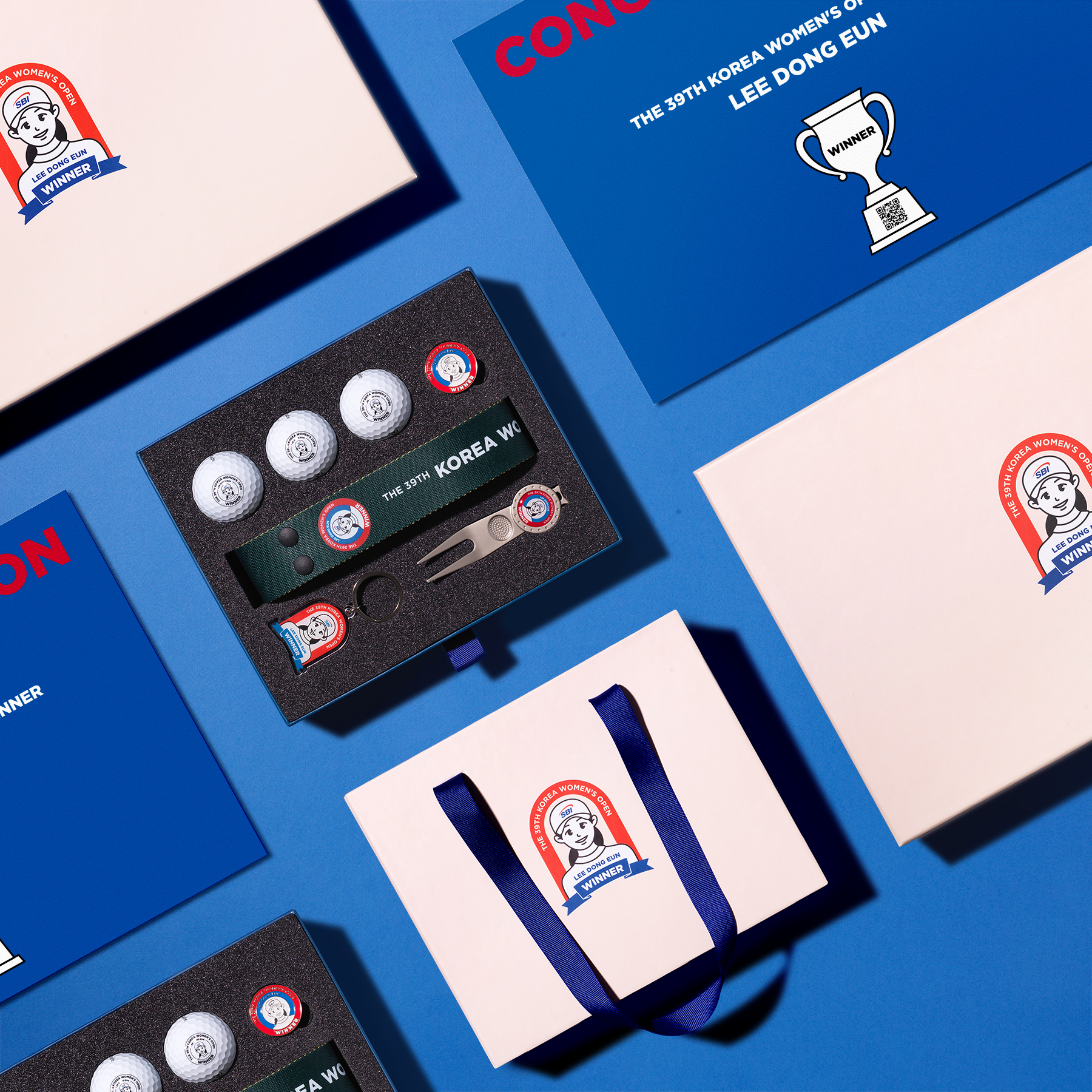 이동은 프로를 캐릭터화 한 일러스트로 엠블럼을 제작하고 이를 이용한 골프공, 디봇툴, 볼마커, 네임택, 키링을 제작했습니다. 또한 SBI 저축은행의 대내외 귀빈들을 위해 이동은 프로의 감사 영상을 확인할 수 있는 QR이 담긴 삽지도 함께 디자인하여 브랜드 키트로써의 장점을 부각시켰습니다.