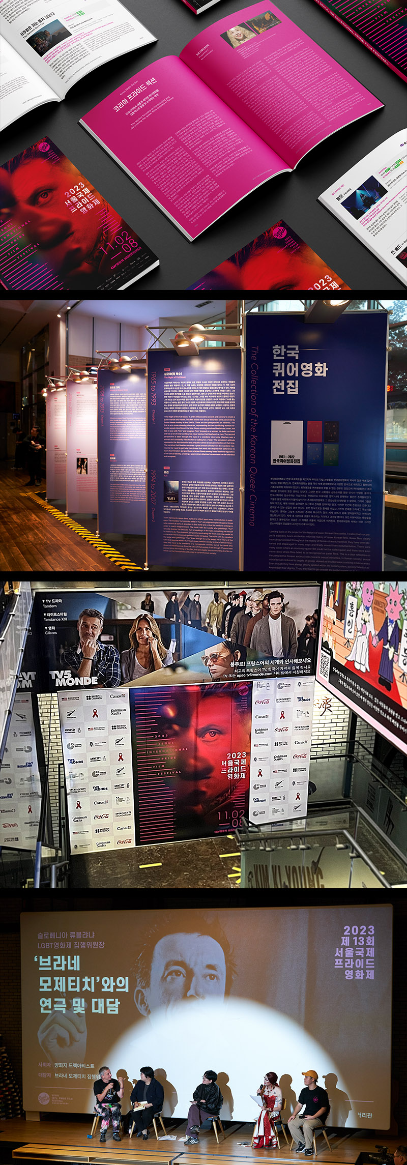 2023년도 제 13회 서울국제프라이드 영화제의 카탈로그를 포함한 행사의 전반적인 디자인을 진행했습니다. 서울국제프라이드영화제는 올해로 13회를 맞이한 국내에서 가장 큰 규모를 자랑하는 성소수자 국제영화제입니다. 다양성, 포용, 자긍심, 연대, 교류라는 다섯 개의 핵심가치를 바탕으로 한국영화의 다양성 확대에 작지만 독창적이고 중요한 축을 맡고 있습니다.