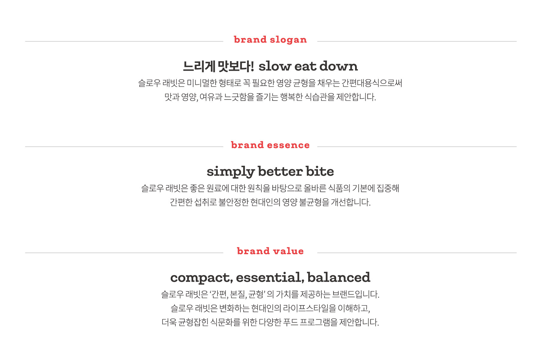 여유있는 시간을 의미하는 Slow와 바쁘고 빠르게 움직이는 현대인을 Rabbit에 비유해 함축적이지만 친근하고 귀엽게 보이는 시그니처 프라이머리로 탄생했습니다. 가볍게 먹는 즐거움을 주는 브랜드 슬로건으로 정리되며 나만의 점심시간을 느리게 맛볼 수 있는 시간으로 의미있게 보내자는 취지를 담은 브랜드입니다. 디지털 CF까지 제작하여 일년이 넘는 시간동안 브랜딩했던 장기 프로젝트입니다.