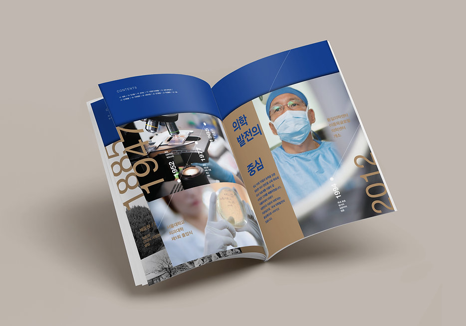 북인북(Book in Book) 형식으로 앞 부분에 근대의료의 역사부터 현재에 이르는 전통을 강조하는 스토리를 극대화하고, 대한민국을 품고 세계로 나아가는 미래에 집중된 이미지와 카피로 전문성을 강조했습니다. 연구분야와 연계 병원의 탄탄한 네트워크를 심플한 다이어그램과 이미지로 표현한 디자인입니다.